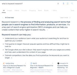 This is an example of an AI Overview for the search query “What is keyword research?”