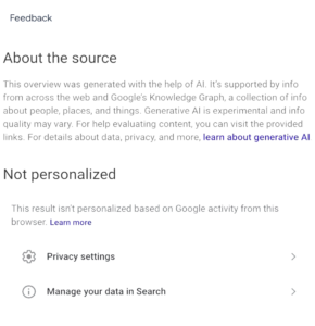 Notice that a brief summary paragraph addressing the search query appears at the top of the page, along with several websites you can visit for more information on the topic. In the top right corner, you can click the three vertical dots next to “Learn more” to read further about the process and provide feedback on the response:
