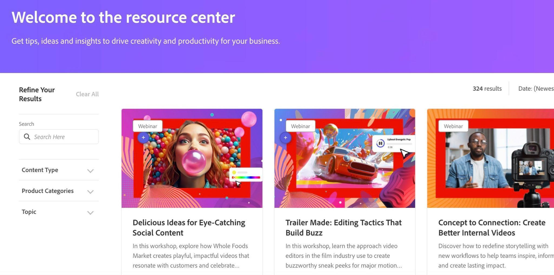 Adobe is a top producer of creative software, offering tools like Photoshop, Illustrator, and Premiere Pro, alongside business-focused solutions like Adobe Experience Cloud. As part of its B2B content marketing strategy, it includes a dedicated ”resource center” on its website featuring a variety of different content formats, such as case studies, white papers, webinars, and tutorials for popular tools.
